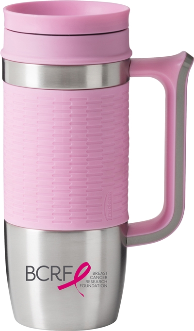 16oz Sleek stainless steel stands out against the pink embossed silicone grip detail and looks sharp from your commute to your desk.A portion of the sales of each item is donated to the Breast Cancer Research Fund.