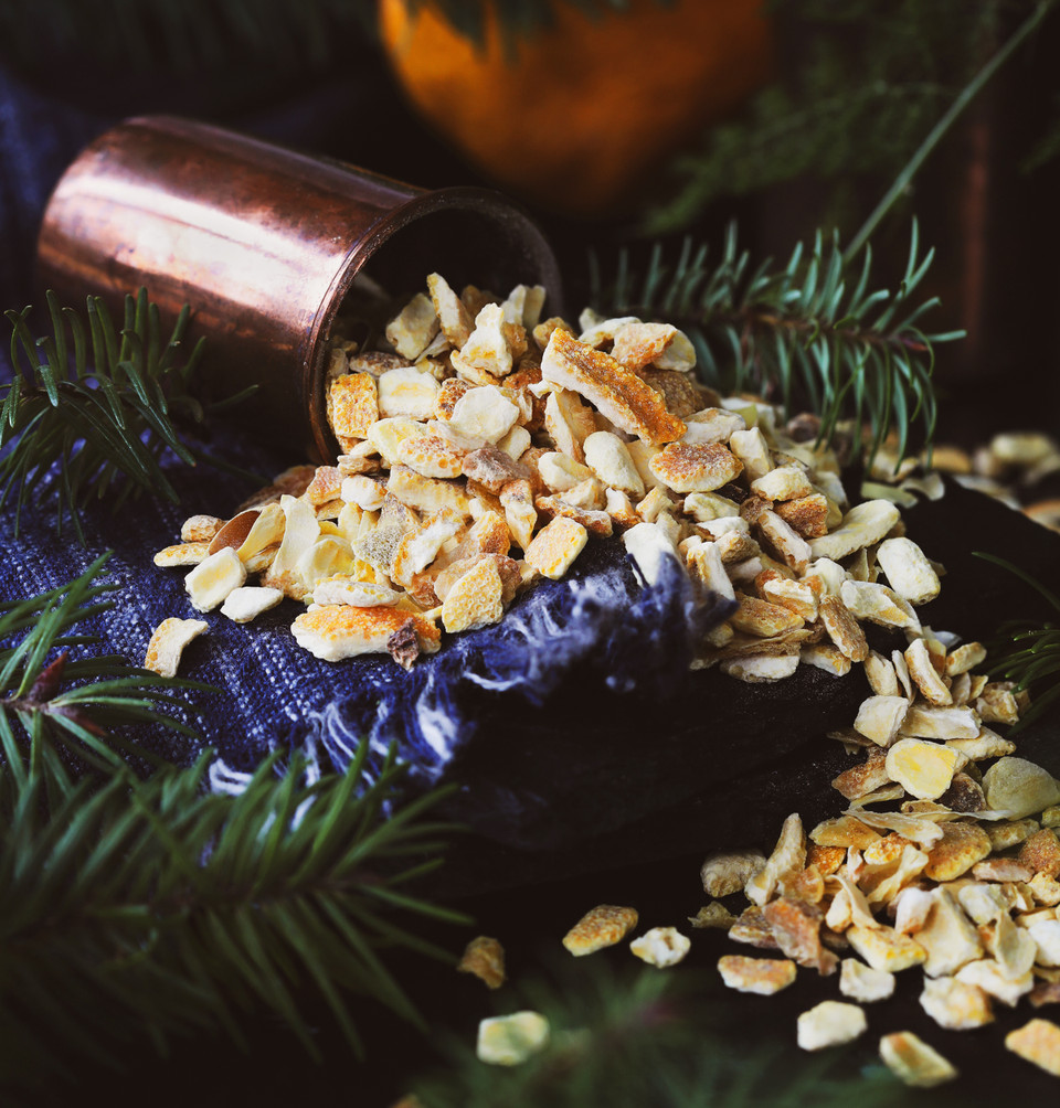 The peel is cut, dried, and ground into powder becoming an ideal application to beverages, culinary dishes, cosmetics, body care recipes, and liquid extracts.